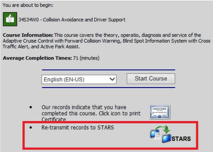 Then from the language selection page you will find the re-tramsmit link . Also included is course description, average completion times and the ability to print your certificates.