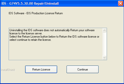 | The process of uninstalling IDS does not automatically remove the IDS software license. There is an option either to retain or to return the license to the License Server during the uninstall process as shown in the screen below. |